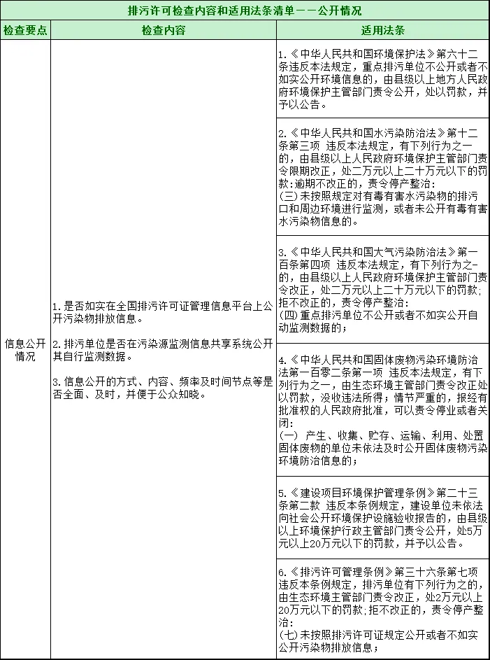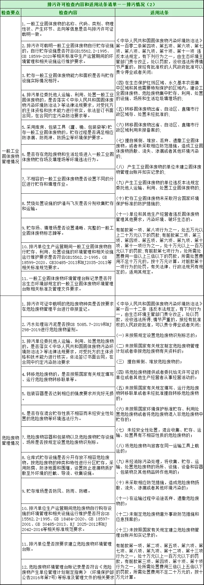 24项常见问题判定清单 排污单位自行监测监督检查表 排污许可检查内容和适用法条清单 一、主要内容 1.生产设施检查 : 1)调查原材料、中间产品、产品的类型、数量 2)及特性等情况。 3)调查生产工艺、设备及运行情况。 4)检查原材料、中间产品、产品的购存与输移过程。 5)检查生产变动情况。 2.污染治理设施检查: 1)排污单位拥有污染治理设施的类型、数量、性能。 2)检查污染治理设施管理维护情况、运行情况、运行记录,是否存在不正常停运情况,是否按规程操作。 3)检查污染物处理量、处理率及处理达标率,有无违法、违章或直接排污的行为。 4)检查重点污染源在线监控设施的运行情况。 3.排污口设置检查: 检查污染物排放口(源)的类型、数量、位置,设置是否规范。 4:污染物排口情况检查: 检查排污口(源)排放污染物的种类、数量、浓度、排放方式及排放去向。 5.应急响应: 检查排污单位是否编制了突发性环境事件应急预案,是否配置比较完备的应急处置设施。 二、水污染源现场检查 1.用水情况: 检查企业的用水量是否合理,用水工艺和设备是否属于国家规定禁止和淘汰的范围,是否浪费水资源。 2.设施的运行状态: 检查水污染防治设施的运行状态及运行管理情况,是否擅自拆除或者闲置。 3.处理能力及处理水量: 1)检查计量装置是否完备;处理能力是否能够满足处理水量的需要。 2)核定处理水量与生产系统产生的水量是否相符。如处理水量低于应处理水量,应检查未处理废水的排放去向。 4.废水的分质管理: 1)检查对于含不同种类和浓度的污染物的废水,是否进行必要的分质管理;对于需进行预处理的生产废水,是否采取了预处理措施。 2)如水污染物中含有必须在车间或车间污水处理设施排放口采样监测的污染物,检查排污单位是否在车间或车间污水处理设施排放口设置了采样监测点,是否在车间处理达标,是否将污染物在处理达标之前与其他废水混合稀释。 5.处理效果: 检查处理后的水质是否达到了国家和地方规定的排放标准,主要污染物的去除率是否达到了规定的水平。 6.污泥处理、处置: 检查废水处理中排出的污泥是否得到及时、有效的处置,是否产生二次污染。 7.污水排放口: 1)检查污水排放口的位置是否符合规定,是否位于国务院、国务院有关部门和省、自治区、直辖市人民政府规定的风景名胜区、自然保护区、生活饮用水地表水源保护区,以及其他需要特别保护的区域内。新建的排污口位于以上区域附近的,是否会对受保护的区域内的水体造成污染。 2)检查排污单位的污水排放口设置是否超过规定数量。 3)检查是否按照规定设置监测采样点。 4)检查是否设置规范的便于测量流量、流速的测流段。 5)检查是否按照规定安装计量装置、污染物在线监测仪和污染防治设施运行监控仪,运行是否正常。 8.排水量复核: 1)有流量计和污染源监控设备的,检查运行记录。 2)有给水计量装置的或有上水消耗凭证的,根据耗水量计算排水量。 3)无计量数及有效的用水量凭证的,参照国家有关标准、手册给出的同类企业用水排水系数进行估算。 9.有毒物质排放: 检查排污单位是否向水体和地下排放有毒物质。 10.排放水质: 检查排放废水是否超过国家或地方排放标准。检查监测仪器、仪表、设备的型号和规格以及检定、校验情况,检查采用的监测分析方法和水质监测记录。目测观察排放废水的表观性状有无异常,有无稀释、偷排行为。如有异常可进行现场测定或采样,或及时通知监测部门采样分析。 11.排水分流: 检查排污单位排水分流是否实行清污分流。 12.事故废水应急处置设施: 检查排污企业的事故废水应急处置设施是否完备,是否可以保障对发生环境污染事故时产生的废水实施截流、贮存及处理。 13.废水的重复利用: 检查处理后的废水的回用情况,鼓励企业开展废水重复利用。 三、大气污染源现场检查 1.燃烧废气: 1)检查燃烧设备的审验手续及性能指标:检查锅炉的性能指标是否符合国家和地方规定的锅炉大气污染物排放标准;检查环保设备的配套状况及环保审批、验收手续。 2)检查燃烧设备的运行状况: 检查排气口的林格曼黑度是否超标,如果超标则分析原因;检查除尘设备的运行状况,干清除是否漏气或堵塞,湿清除灰水的色泽和流量是否正常;检查灰水及灰渣的去向,防止二次污染。 3)检查二氧化硫的控制:检查燃烧设备的设置、使用是否符合国家控制二氧化硫和酸雨的政策,用煤的含硫量是否符合国家规定,大型燃烧设备是否有脱硫装置。 2.工艺废气、粉尘和恶臭污染源: 1)检查排放含有毒、有害物质的废气、粉尘的情况。 2)检查排放恶臭的情况。 3)检查可燃性气体的回收利用情况。 4)检查可散发有毒、有害气体和粉尘的运输、装卸、贮存的环保防护措施。 5)检查煤场、料场、货场的防扬尘措施。 3.消耗臭氧层物质: 检查企业是否违反规定生产、进口消耗臭氧层物质。 4.大气污染防治设施: 1)除尘系统:检查实际除尘效率是否符合要求,除尘器是否得到较好的维护,保持密封性;除尘设施产生的废水、废渣是否得到妥善处理、处置,避免二次污染;处理后的烟气黑度是否达到国家或地方规定的排放标准。 2)气态污染物净化系统:检查废气收集系统效果;检查气体排放口主要污染物的排放是否符合国家或地方标准;检查处理中产生