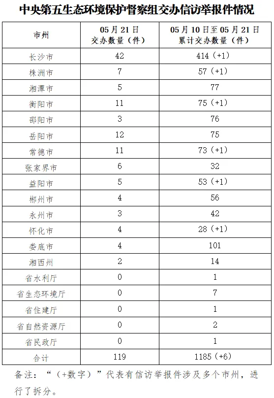 中央第五生态环境保护督察组今天向湖南交办群众信访举报件119件(来电举报74件,来信举报45件),其中重点件14件。