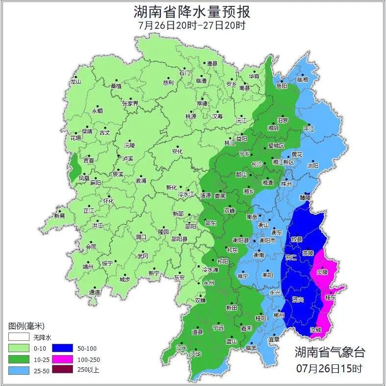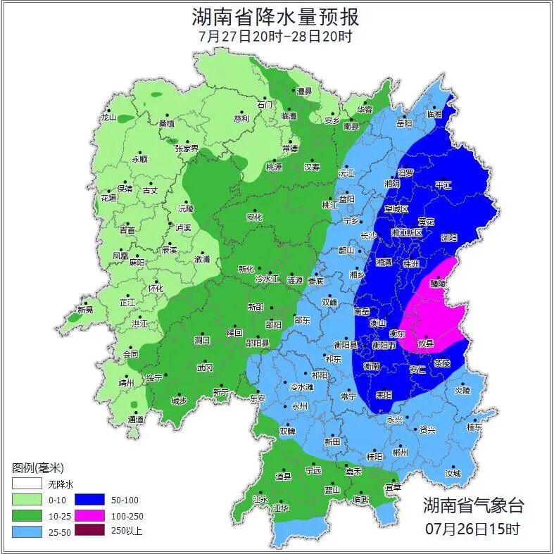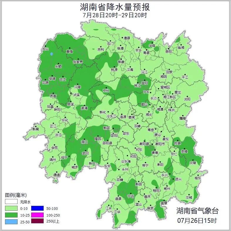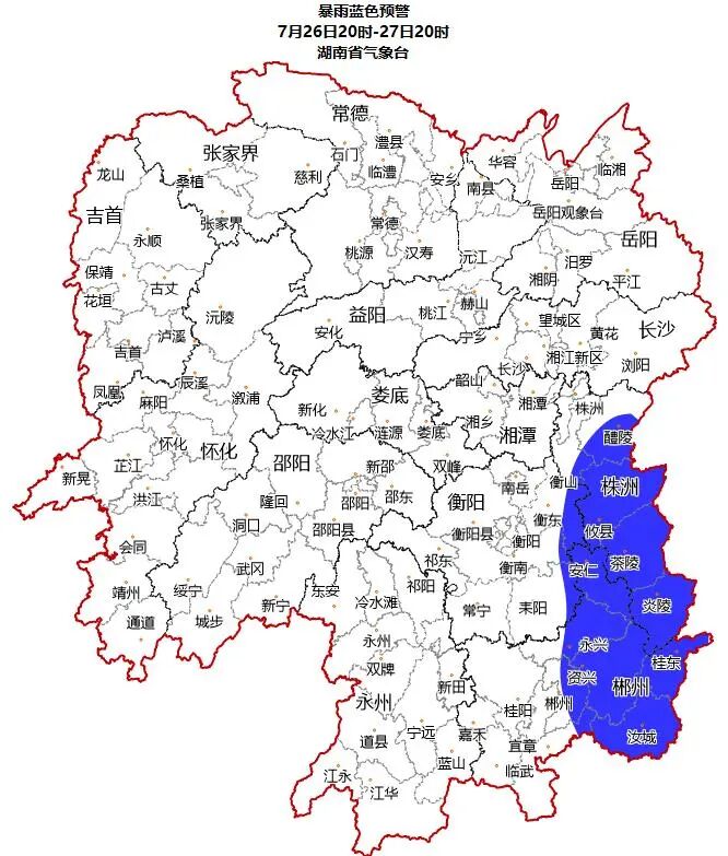 湖南省气象台7月26日16时发布暴雨蓝色预警: