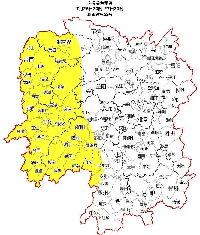 预计26日20时至27日20时,邵阳、张家界、永州西北部、怀化、湘西州将达到35℃以上高温,局部地区将达37℃以上,请做好防范。