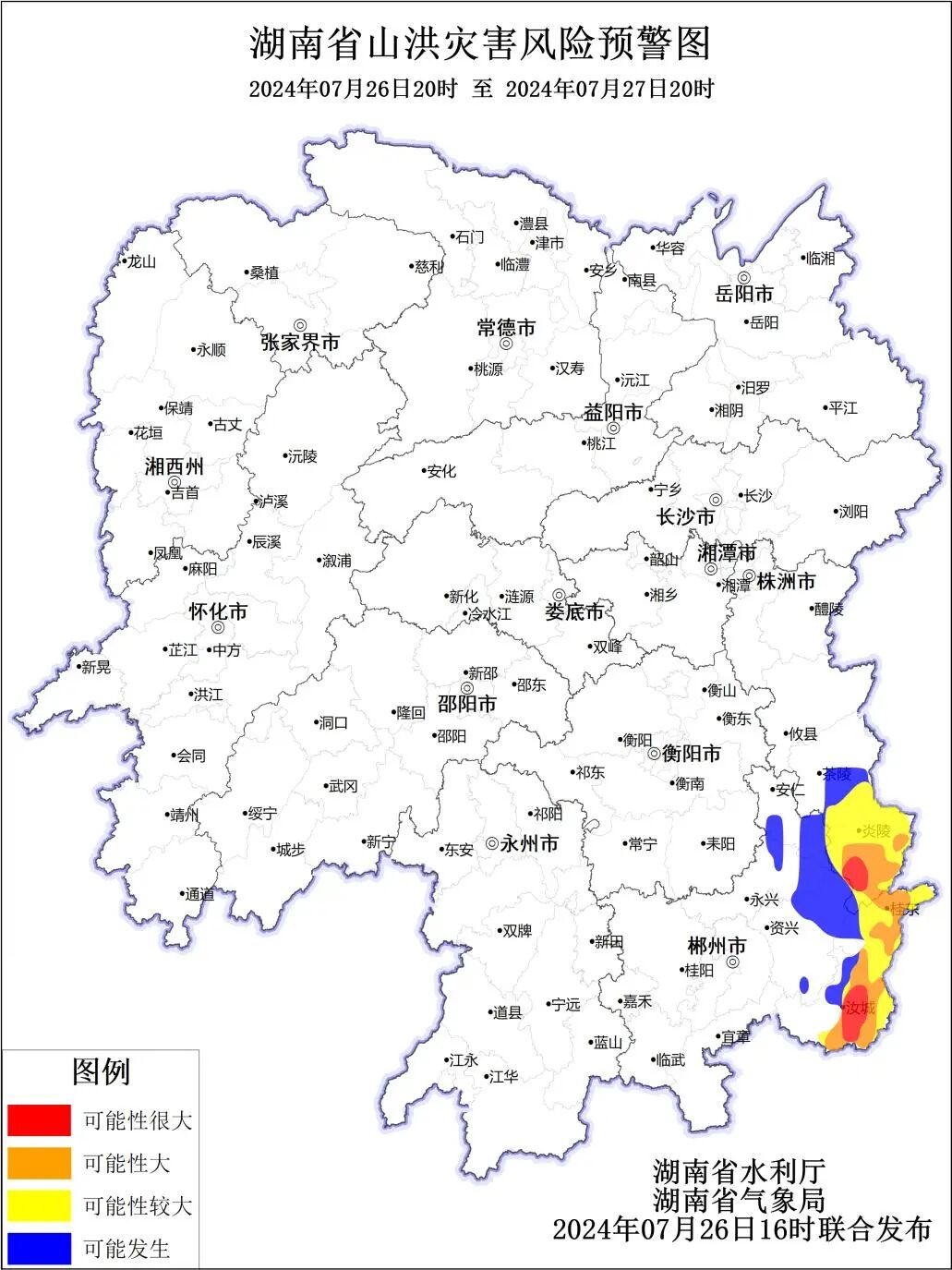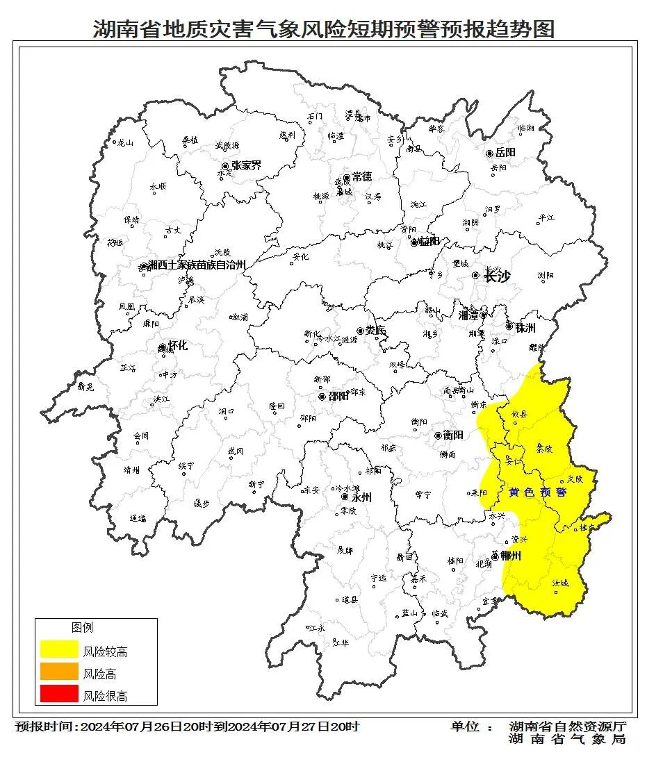 根据地质灾害成灾规律和孕灾条件,结合2024年7月26日短期气象预报情况,省自然资源厅与省气象局联合会商得出如下结论:自7月26日20:00至27日20:00,受降雨影响,湘东、湘东南大部分区域发生突发性地质灾害风险较高(黄色预警)。