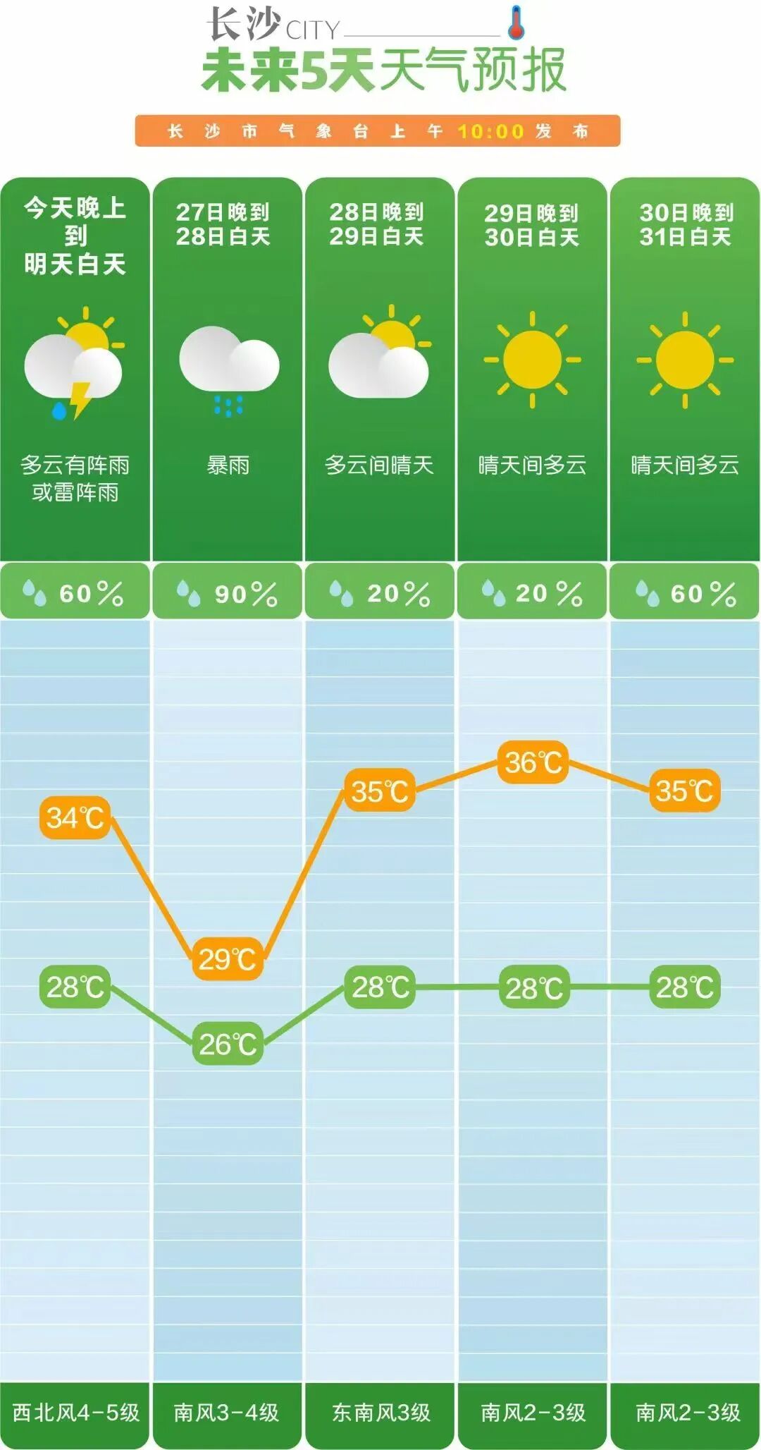 27日晚上到28日白天,湘东、湘南阴天有大到暴雨,其中株洲(市区、茶陵、醴陵、攸县)、衡阳(衡东)有大暴雨,其他地区多云有小到中等阵雨或雷阵雨;湘东地区南风3~4级,其他地区南风2~3级,阵风风力8~10级;最高气温湘西34~36℃,其他地区31~33℃;最低气温26~28℃。