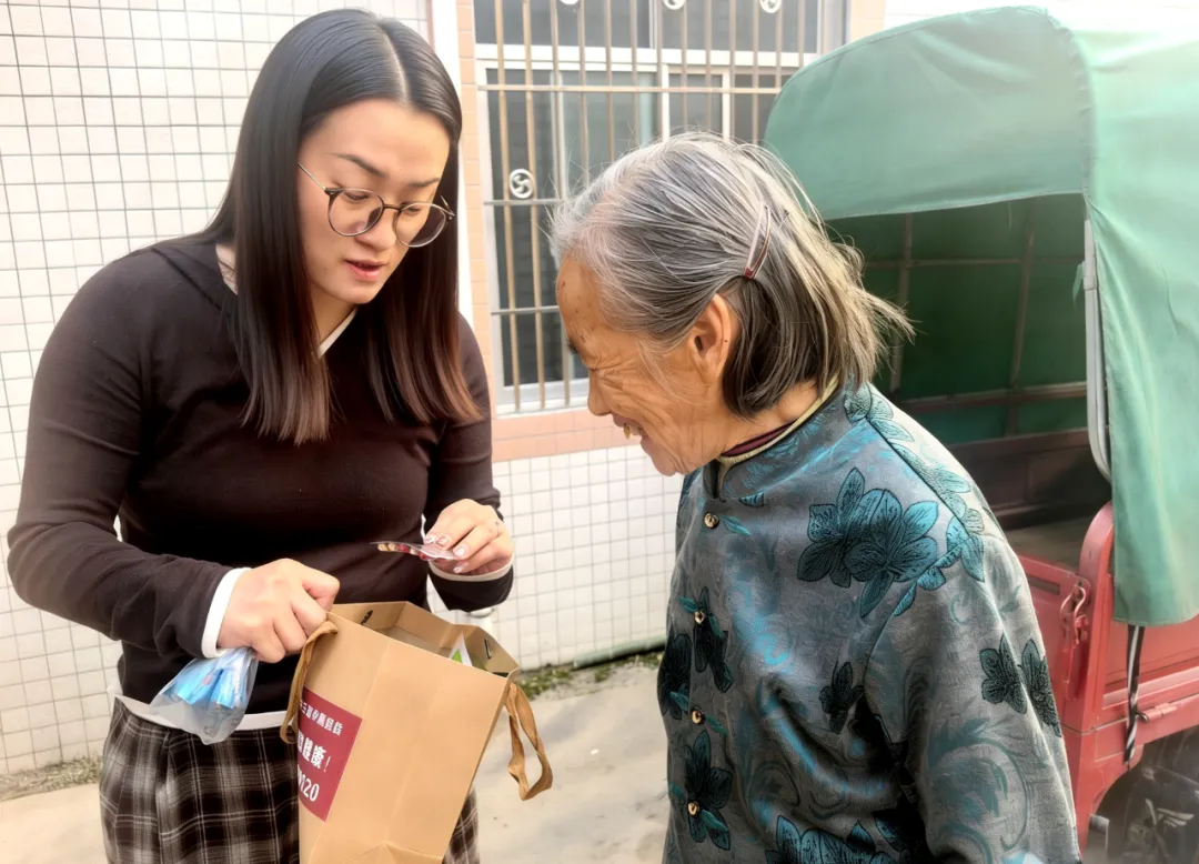 在村民奶奶家中,医务工作者仔细询问老人状况后,从“健康包”中取出药品叮嘱:“大姨,这个防感颗粒觉得有点鼻塞头晕时可以冲服,香包挂床头能安神助眠。”
