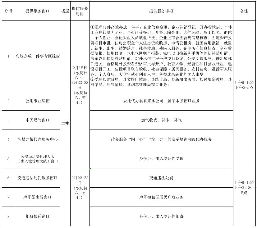 5.县公安局治安管理大队(人口出入境管理大队)、县交警大队处罚中心、县卢阳派出所、县邮政快递窗口(仅2月22、23日/农历初六、初七;上午9:00-12:00 ;下午14:30-17:00)