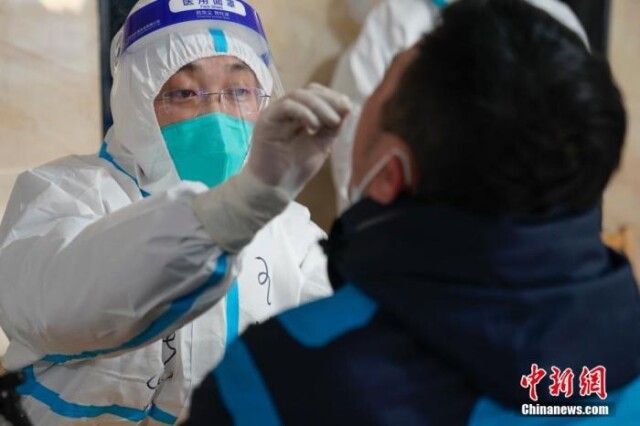 1月14日,哈尔滨市香坊区,社区居民接受核酸检测。 中新社记者 吕品 摄