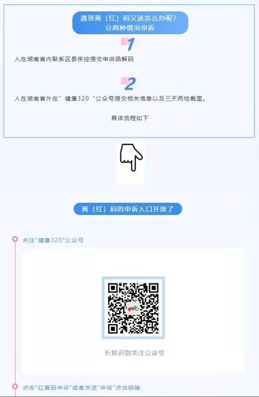 分两种情况申诉:身处湖南省内者,请联系区县疾控提交申诉函解码;身处湖南省外者,请于“健康320”公众号提交相关信息及三天两检(72小时内两次核酸检测证明,且两次监测时间间隔在24小时以上)截图。