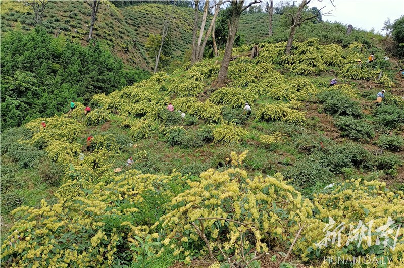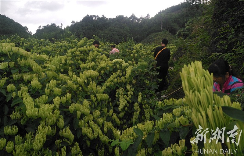 仲夏时节,湖南省汝城县文明瑶族乡盈洞片区,漫山遍野金银花开,当地群众挎着竹筐,面带喜色进行采摘,现场一片忙碌。