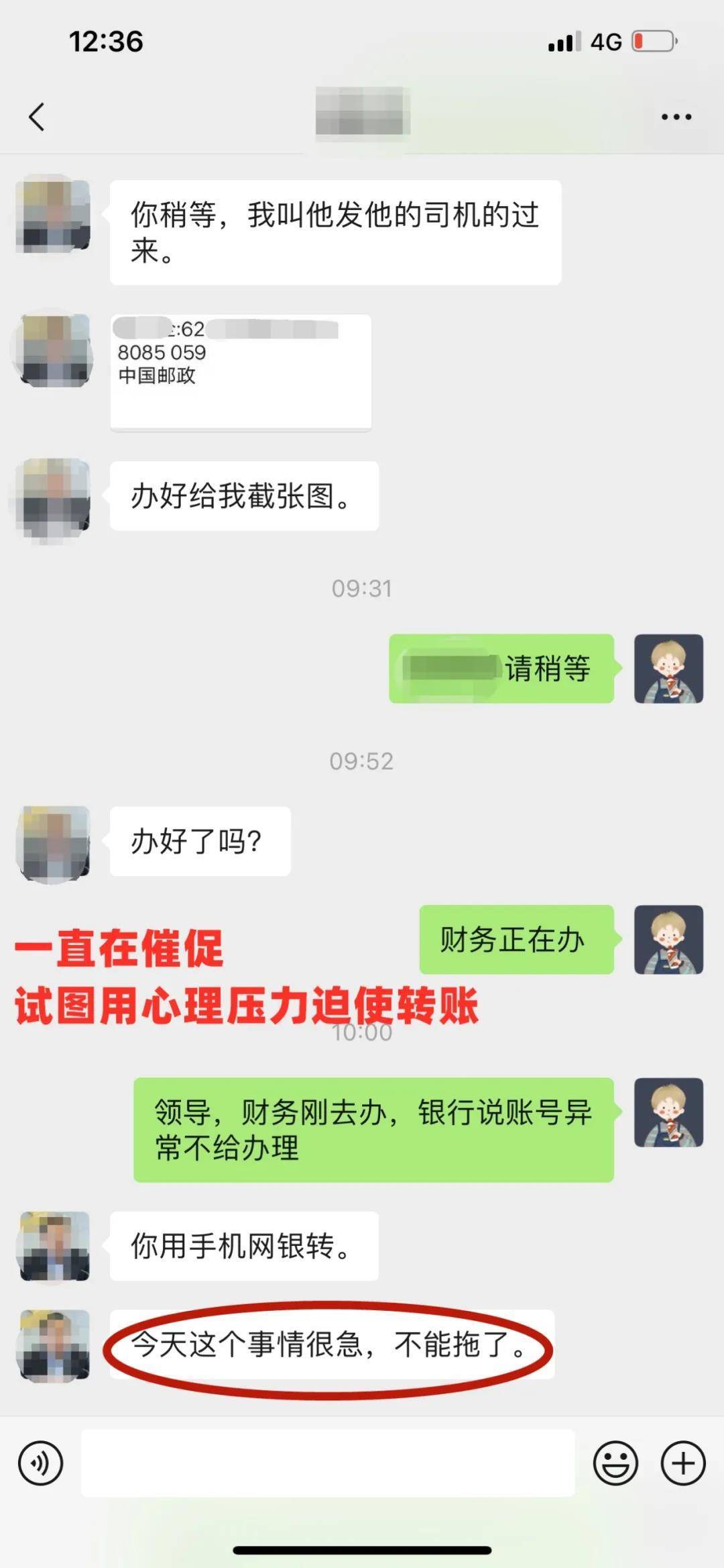 第四步:解释钱款暂时未到账原因,并以事情紧急为由,催促受害人转账。