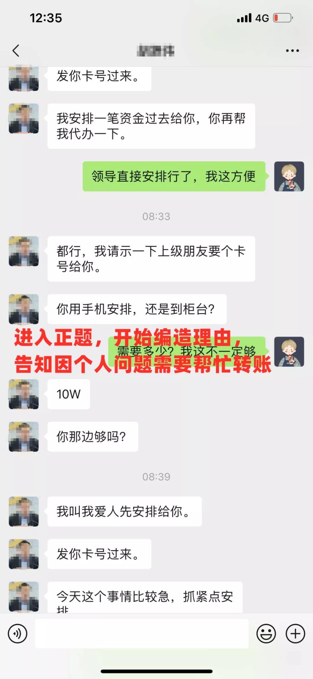 正当受害人感觉与“领导”的关系已更进一步时,骗子顺势而为,提出各种各样的转账汇款借口,比如,亲戚借钱、上级领导要求转账、朋友急用等等。
