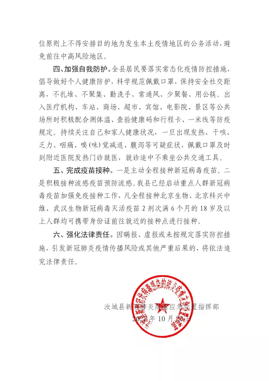四、加强自我防护。全县居民要落实常态化疫情防控措施,倡导做好个人健康防护,科学规范佩戴口罩,保持安全社交距离,不扎堆、不聚集、勤洗手、常通风、少聚餐、用公筷。出入医疗机构、车站、商场、超市、宾馆、电影院、景区等公共场所时积极配合测体温、查验健康码和行程卡、一米线等防疫规定。持续关注自己和家人健康状况,一旦出现发热、干咳、乏力、咽痛、嗅(味)觉减退、腹泻等可疑症状,佩戴口罩及时到附近医院发热门诊就医,就诊途中不乘坐公共交通工具。