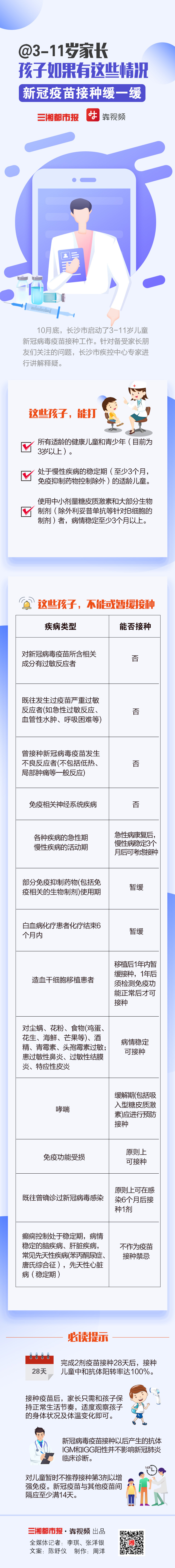 三湘都市报11月2日讯(全媒体记者 李琪 张洋银 通讯员 刘姝)10月底,长沙市启动了3-11岁儿童新冠病毒疫苗接种工作。家长在收到新冠疫苗接种摸底表时,脑子里或许画了无数遍问号,“我的孩子能不能打”。针对这些情况,长沙市疾控中心专家进行讲解释疑。
