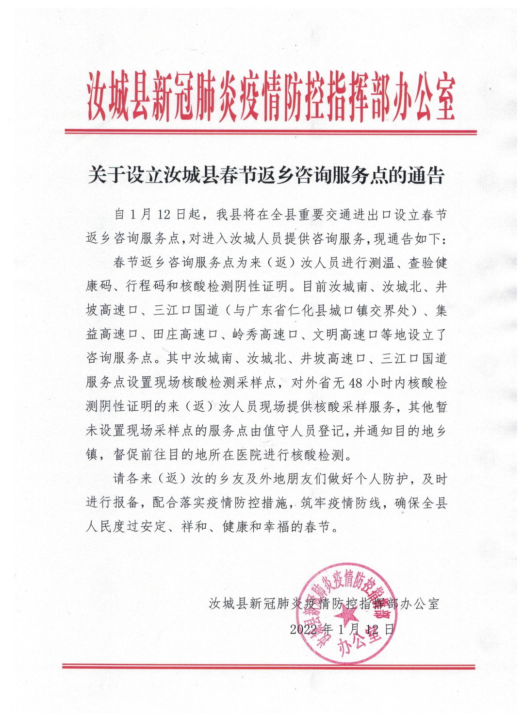 自1月12日起,我县将在全县重要交通进出口设立春节返乡咨询服务点,对进入汝城人员提供咨询服务,现通告如下: