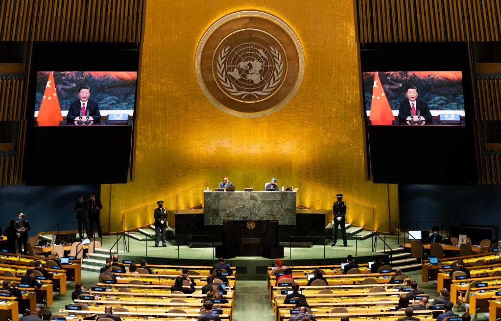 2021年9月21日,习近平在北京以视频方式出席第七十六届联合国大会一般性辩论并发表重要讲话。新华社记者王迎摄