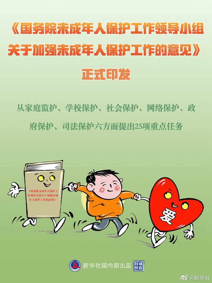 据介绍,《国务院未成年人保护工作领导小组关于加强未成年人保护工作的意见》是国务院未成年人保护工作领导小组成立以后制发的首份政策文件,提出的工作要求涉及家庭监护、学校保护、社会保护、网络保护、政府保护、司法保护6个方面。