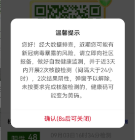 如按照弹窗提示完成核酸检测,结果为阴性,弹窗予以自动解除。