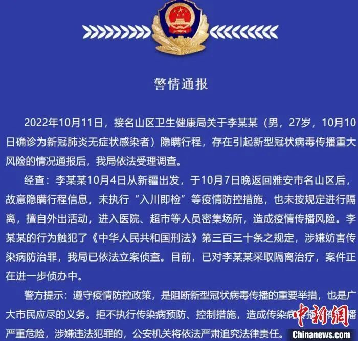 10月12日凌晨,四川省雅安市警方发布警情通报称,10月11日,接名山区卫生健康局关于李某某(男,27岁,10月10日确诊为新冠肺炎无症状感染者)隐瞒行程,存在引起新型冠状病毒传播重大风险的情况通报后,雅安市公安局名山区分局依法受理调查。经查:男子李某某10月4日从新疆出发,于10月7日晚返回雅安市名山区后,故意隐瞒行程信息,未执行“入川即检”等疫情防控措施,也未按规定进行隔离,擅自外出活动,进入医院、超市等人员密集场所,造成疫情传播风险。