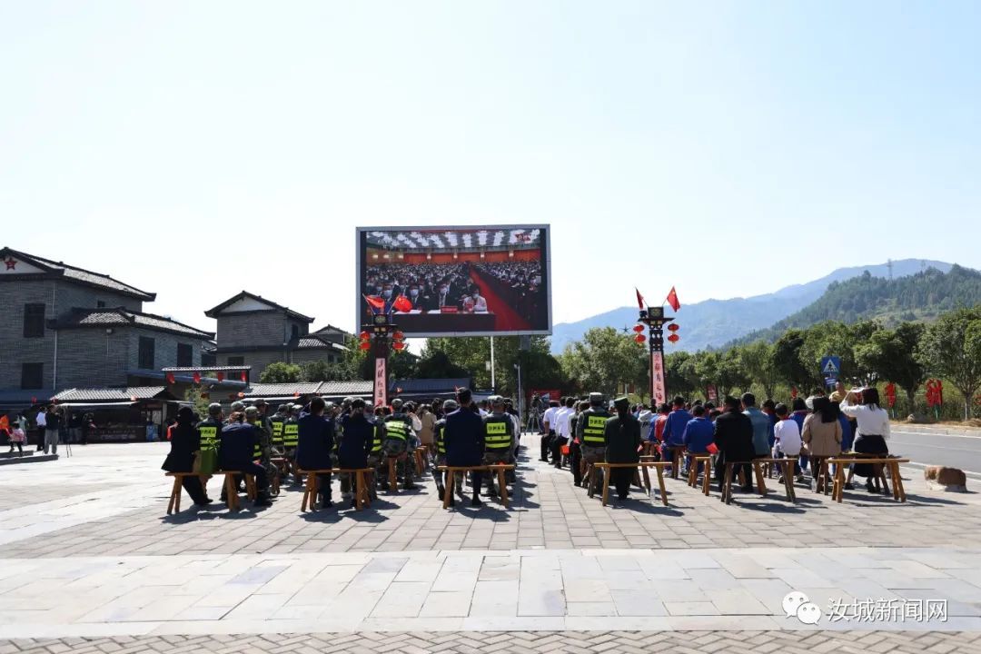 汝城县沙洲村村干部、驻村工作队、沙洲芙蓉学校部分学生、村民代表及部分党员干部等在沙洲民俗广场集中观看党的二十大开幕会