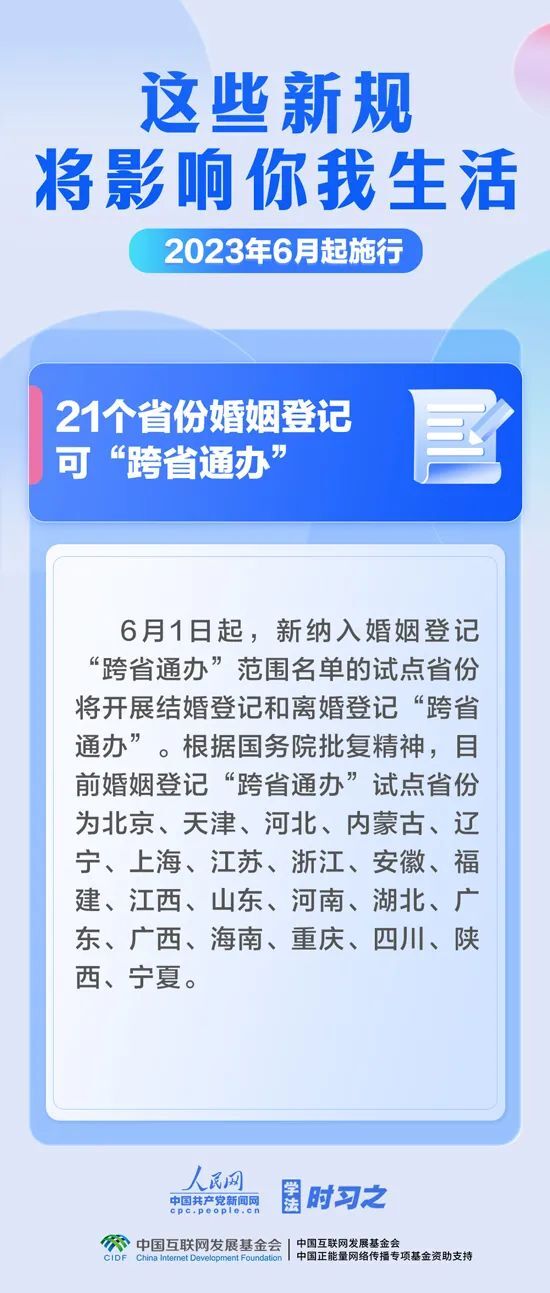 依法从严惩处性侵害未成年人犯罪,21个省份婚姻登记可“跨省通办”,规范个人信息出境活动……6月,这些新规施行,将影响你我生活。